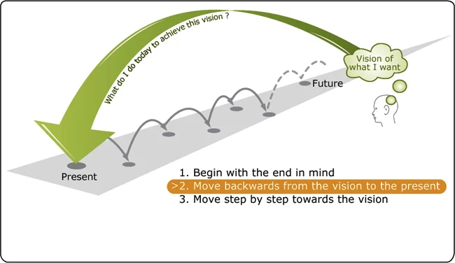 Till skillnad från ”forecasting”, som strävar efter att förutse en framtid utifrån en tänkt riktning med nuläget som utgångspunkt, utgår backcasting från en tänkt framtid och ställer sig frågan om vilka steg som måste tas för att kunna nå dit givet var vi befinner oss idag.
